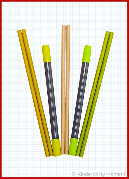 Begonnen habe ich damit, die Papierstrohhalme mit Filzstiften in den Farben des grünen Papiers zu bemalen.
